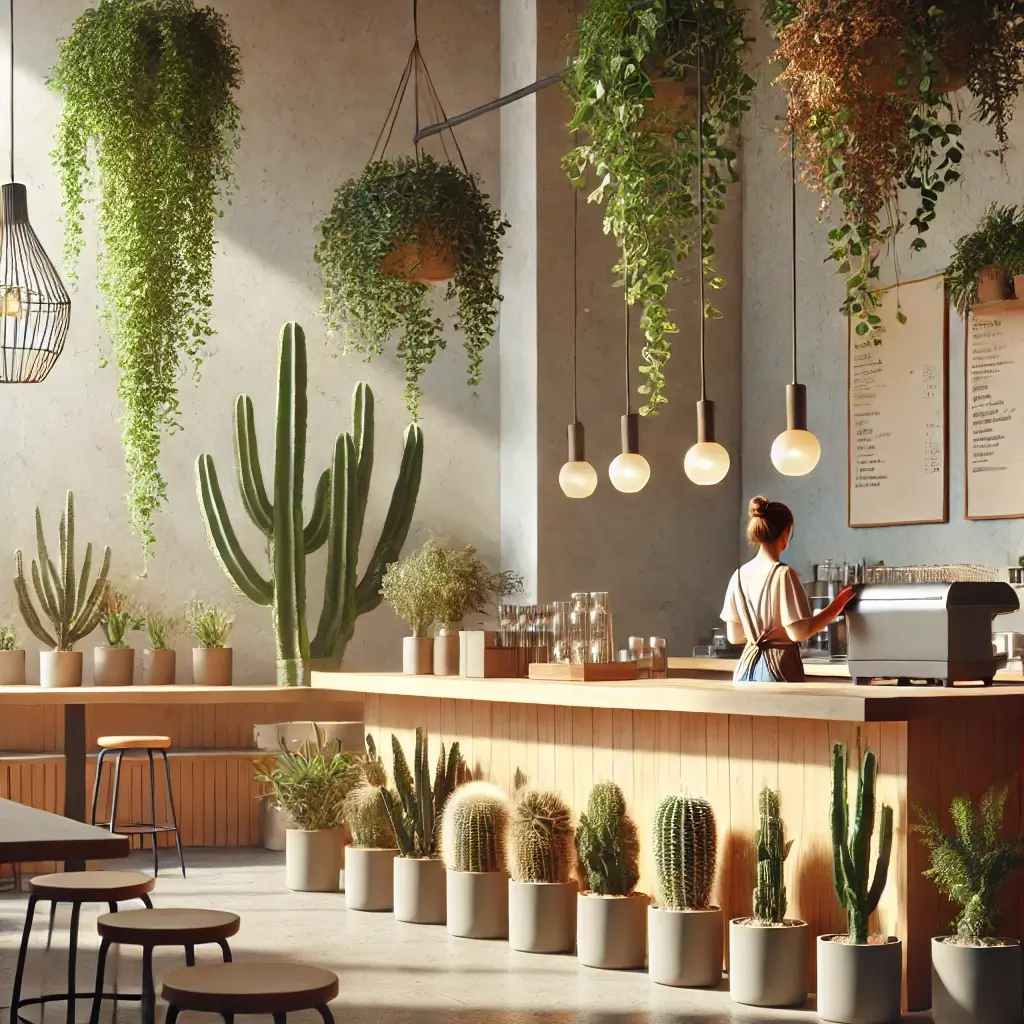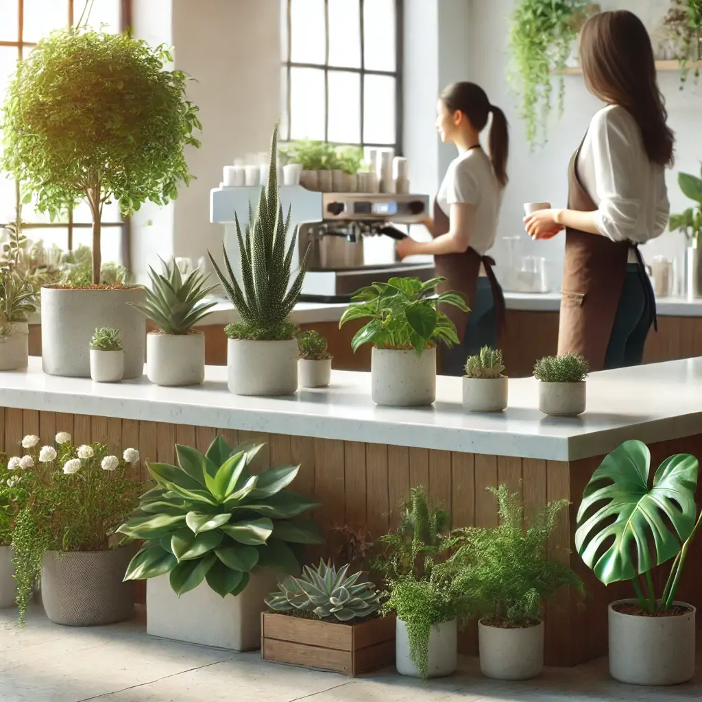 - 배치 팁: 카페 코너에 중간 크기의 식물을 배치해 공간을 분리하거나 포인트를 줄 수 있습니다. 덩굴 식물을 선반에 배치하거나 벽면을 장식하여 고객의 시선을 끌 수 있도록 하세요.